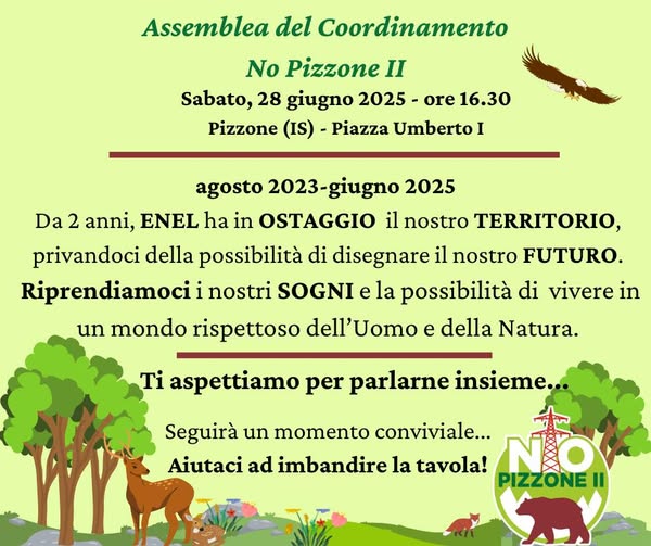 Si terrà a Pizzone, in piazza Umberto I, Sabato 28 giugno 2025 a partire dalle ore 16:30, l’assemblea indetta dal coordinamento NO PIZZONE II. Importanti i temi che saranno affrontati nel corso dell’incontro, a partire dallo stallo che dall’agosto del 2023 – data in cui si è appresa la volontà di Enel di voler realizzare nel territorio a ridosso del PNALM la nuova centrale elettrica – ha scatenato una guerra a colpi di carte bollate e stop al progetto, ma che non ne hanno ancora cancellato definitivamente la minaccia.